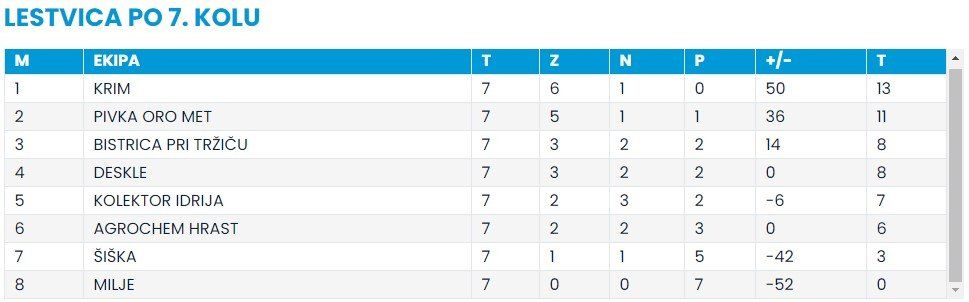 Po jesenskem delu prvenstva je v najboljšem položaju ljubljanski Krim s 13 točkami, pivški Oro Met je zbral 11 točk, tretje mesto pa si trenutno delita Bistrica pri Tržiču in Deskle z 8 točkami.