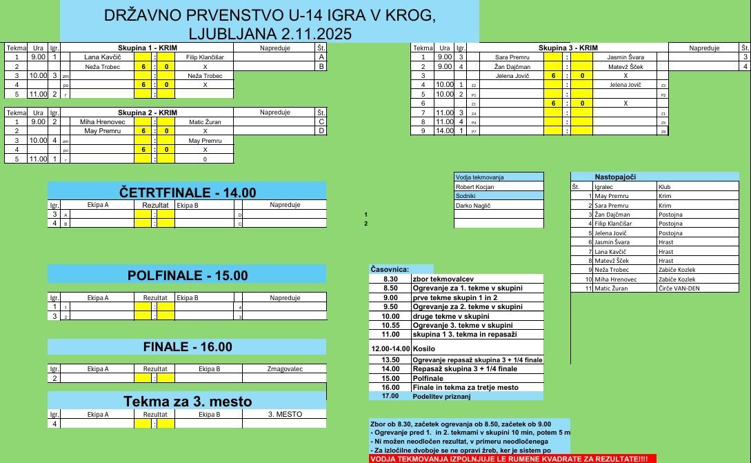 Državno prvenstvo v igri v krog v kategoriji U-14 bo v nedeljo, 2.11.2025, gostila OBZ Ljubljana na balinišču BŠK Krim. Komisija za mladino BZS je opravila žreb in časovnico tekmovanja. Rezultate boste lahko spremljali preko spletne in Facebook strani Balinarske zveze Slovenije.