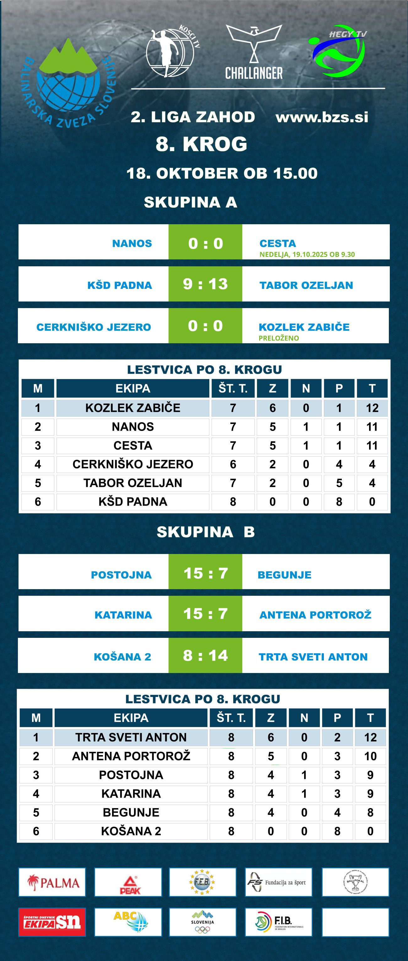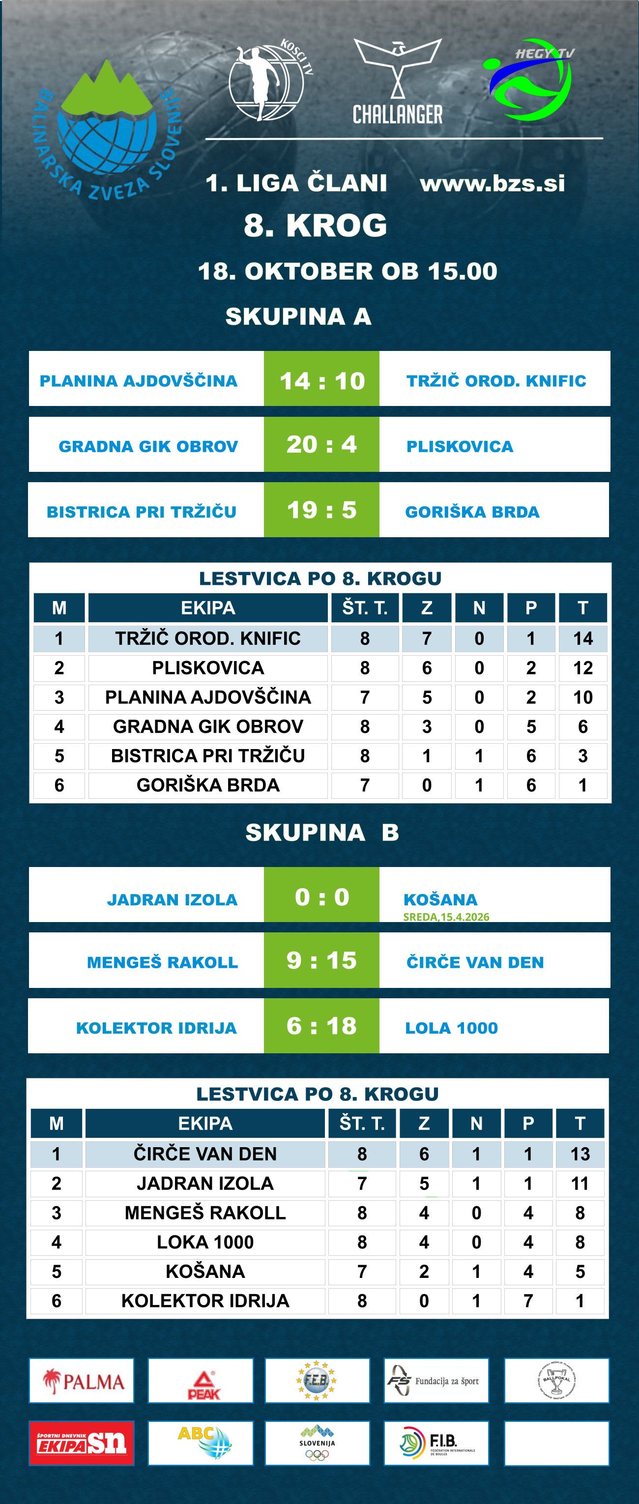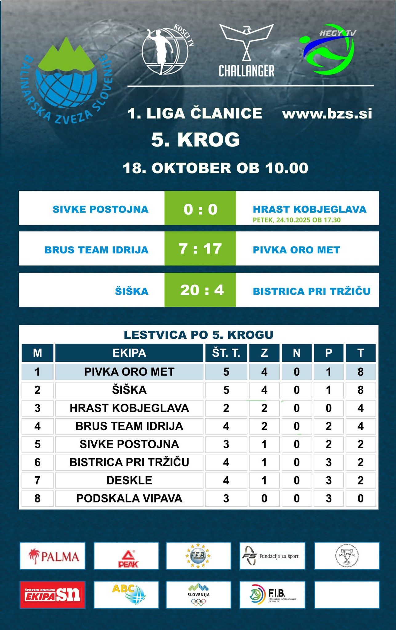 Konec tedna je prinesel nov ligaški krog v 1. ligi - članice, 1. ligi ter 2. ligi - vzhod in 2. ligi - zahod. Igralka ljubljanske Šiške Leja Vehovec je na sobotni tekmi 1. lige – članice z 31 točkami v natančnem zbijanju izenačila slovenski rekord pri članicah. Razpored tekem in rezultate lahko najdete na spletni strani BZS pod zavihkom Tekmovanja/Državne lige 2025/26 in preko aplikacije Challanger ter teletekstu RTV Slovenija.
