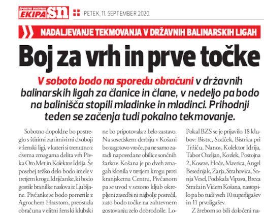 Sobotni 11. krog Super lige je prinesel štiri pomembne obračune, ki so vplivali na stanje na vrhu in v drugi polovici prvenstvene lestvice. Škofjeloška Trata je na gostovanju pred kamerami morala priznati premoč sežanski Skali, QAP Postojna je slavila na zahtevnem gostovanju v Zabičah, kobjeglavski Hrast je premagal Marjetico Koper, zadnjeuvrščeni Velenjčani pa so se z gostovanja v Pivki vrnili s prvo točko. Posnetek derbija iz Sežane si lahko ogledate na spodnji povezavi, razpored tekem in rezultate pa lahko najdete na spletni strani BZS pod zavihkom Tekmovanja/Državne lige 2025/26 in preko aplikacije Challanger ter teletekstu RTV Slovenija.