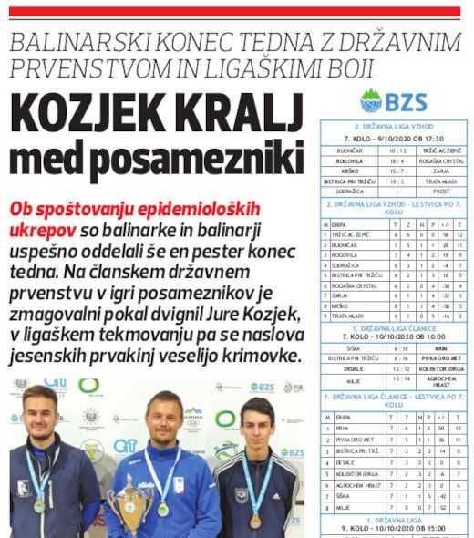 Ob spoštovanju epidemioloških ukrepov so balinarke in balinarji uspešno oddelali še en pester konec tedna. Na članskem državnem prvenstvu v igri posameznikov je zmagovalni pokal dvignil Jure Kozjek, v ligaškem tekmovanju pa se naslova jesenskih prvakinj veselijo krimovke.