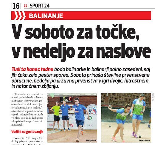 Tudi ta konec tedna bodo balinarke in balinarji polno zasedeni, saj jih čaka zelo pester spored. Sobota prinaša številne prvenstvene obračune, nedelja pa državna prvenstva v igri dvojic, hitrostnem in natančnem zbijanju.