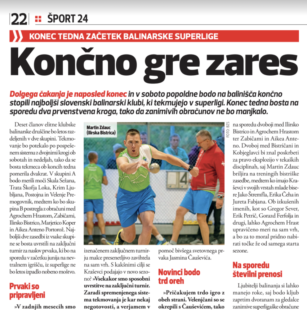Balinarska zveza Slovenije razpisuje nova termina za TEČAJ POSEBNIH VSEBIN 1. stopnje in TEČAJ POSEBNIH VSEBIN 2. stopnje za Strokovne delavce. Tečaja bosta potekala od marca do sredine junija 2026. Rok prijav je podaljšan do 10.2.2026. Balinarska zveza Slovenije razpisuje sklop predavanj posebnih vsebin, ki predstavljajo drugi del vseh programov usposabljanja 1. in 2. stopnje sprejetih po Zakonu o športu, ki je stopil v veljavo 24.6.2017. Predavanj za posebne vsebine 1. stopnje se lahko udeležijo vsi posamezniki/ice s potrdilom o opravljenih obveznih vsebinah za Strokovni delavec 1 - Trener balinanja 1 (prejšnji inštruktor) v letu 2025 ali v preteklih letih. Predavanj za posebne vsebine 2. stopnje se lahko udeležijo vsi posamezniki/ice s potrdilom o opravljenih obveznih vsebinah za Strokovni delavec 2 - Trener balinanja 2 (prejšnji trener balinanja) v letu 2025 ali v preteklih letih. Tečaja bosta potekala v marcu, aprilu, maju in prvi polovici junija ter bosta delno izvedena na daljavo, torej preko ene od aplikacij za učenje na daljavo (Zoom, Skype, MS Teams) in preko predavanj v klasični obliki, v skladu z veljavnimi Pravili s programi o usposabljanju strokovnih delavcev v Balinarski zvezi Slovenije. Izvršni odbor BZS na 13. seji dne, 20.2.2023, sprejel dopolnitev Pravil o tekmovanjih, ki so stopila v veljavo s pričetkom sezone 2023/24. Dopolnitev 51. člena Pravil v tekmovanjih: - Na tekmah vodi ekipo vodja ekipe z veljavno licenco v Republiki Sloveniji za tekoče tekmovalno leto. Naveden mora biti v zapisniku in biti prisoten ves čas tekme. - Licenco za vodenje ekipe pridobi le oseba, ki ima naziv strokovnega delavca v organizaciji BZS (strokovni delavec I. ali II.) - Podatki o strokovni usposobljenosti iz prejšnjega odstavka se vpišejo v člansko izkaznico. - V kolikor strokovni delavec ni član kluba oz. ekipe, mora imeti sklenjeno pogodbo za vodenje ekipe, iz katere so razvidne medsebojne pravice in obveznosti. - Ekipa, ki nastopa brez prisotnosti vodje ekipe, se kaznuje z opominom. V primeru ponovne odsotnosti se kaznuje z denarno kaznijo 120 evrov. V vsakem naslednjem primeru se kazen podvoji. Klub mora denarno kazen plačati do tekme naslednjega kroga. - V odsotnosti vodje ekipo vodi kapetan, kar mora biti razvidno iz zapisnika o tekmi. - V primeru, ko prijavljeni vodja ekipe nastopa kot igralec, v času ko igra, nima pravice zahtevati minute odmora za svojo ekipo. STROKOVNI DELAVEC 1 POGOJI ZA USPOSABLJANJE V NAZIV STROKOVNI DELAVEC 1: Kandidat za usposabljanje v tem programu mora izpolnjevati naslednje pogoje: najmanj dokončana 3-letna poklicna šola najmanj 4 leta tekmovalnih izkušenj starost nad 18 let sposobnost za usposabljanje igralcev v posameznih elementih balinarske igre opravljen obvezni del usposabljanja 1. stopnje na Fakulteti za šport KOTIZACIJA IN PRIJAVA: Cena predavanj posebnih vsebin - 300,00 EUR. Rok prijave: 10.2.2026. Rok plačila: 10.2.2026. Naprošamo vas, da prijavo na sklop predavanj posebnih vsebin pošljete pisarni Balinarske zveze Slovenije preko elektronske pošte: info@bzs.si Vaša prijava naj vsebuje: ime in priimek naslov, tel. številka, e-mail, potrdilo o opravljenem izobraževanju za obvezni del vsebin, potrdilo o plačilu kotizacije (posredovati do 10.2.2026). Predavanja bosta izvedla usposobljena predavatelja Jure Kozjek in Aleš Borčnik. O točnih datumih in načinu izvedbe izobraževanja boste pravočasno obveščeni preko elektronske pošte. STROKOVNI DELAVEC 2 POGOJI ZA USPOSABLJANJE V NAZIV STROKOVNI DELAVEC 2: Kandidat za usposabljanje v tem programu mora izpolnjevati naslednje pogoje: Strokovna usposobljenost prve stopnje, pridobljena po programu usposabljanja za izbrani šport Starost najmanj 18 let Najmanj srednja poklicna izobrazba opravljen obvezni del usposabljanja 2. stopnje na Fakulteti za šport KOTIZACIJA IN PRIJAVA: Cena predavanj posebnih vsebin - 400,00 EUR. Rok prijave: 10.2.2026. Rok plačila: 10.2.2026. Naprošamo vas, da prijavo na sklop predavanj posebnih vsebin pošljete pisarni Balinarske zveze Slovenije preko elektronske pošte: info@bzs.si Vaša prijava naj vsebuje: ime in priimek naslov, tel. številka, e-mail, potrdilo o opravljenem izobraževanju za obvezni del vsebin, potrdilo o plačilu kotizacije (posredovati do 10.2.2026). Predavanja bosta izvedla usposobljena predavatelja Jure Kozjek in Aleš Borčnik. O točnih datumih in načinu izvedbe izobraževanja boste pravočasno obveščeni preko elektronske pošte. Podatki za plačilo: Balinarska zveza Slovenije Tržaška 2 1000 Ljubljana Namen: Plačilo kotizacije za izobraževanje Strokovni delavec 1/2 - Ime in priimek) TRR: SI56 0208 3001 7228 730 BIC banke: LJBASI2X