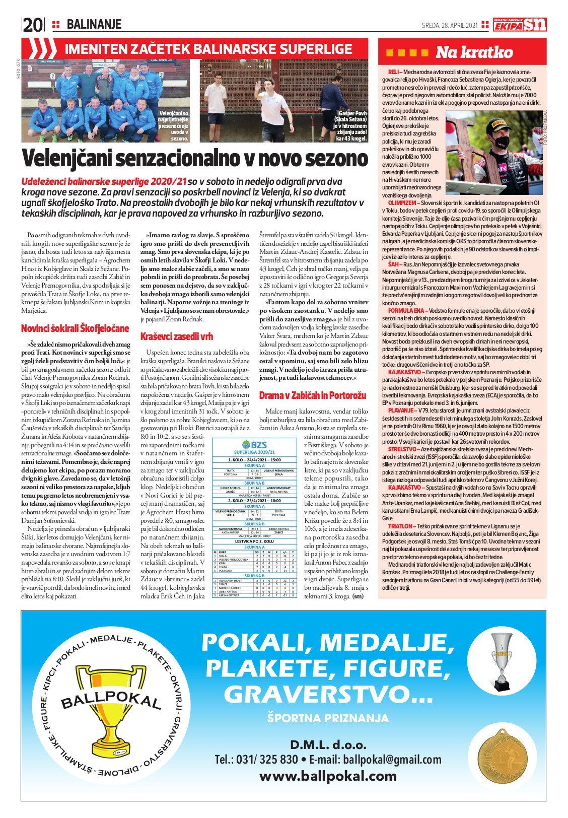 Udeleženci balinarske superlige 2020/21 so v soboto in nedeljo odigrali prva dva kroga nove sezone. Za pravi senzaciji so poskrbeli novinci iz Velenja, ki so dvakrat ugnali škofjeloško Trato. Na preostalih dvobojih je bilo kar nekaj vrhunskih rezultatov v tekaških disciplinah, kar je prava napoved za vrhunsko in razburljivo sezono.