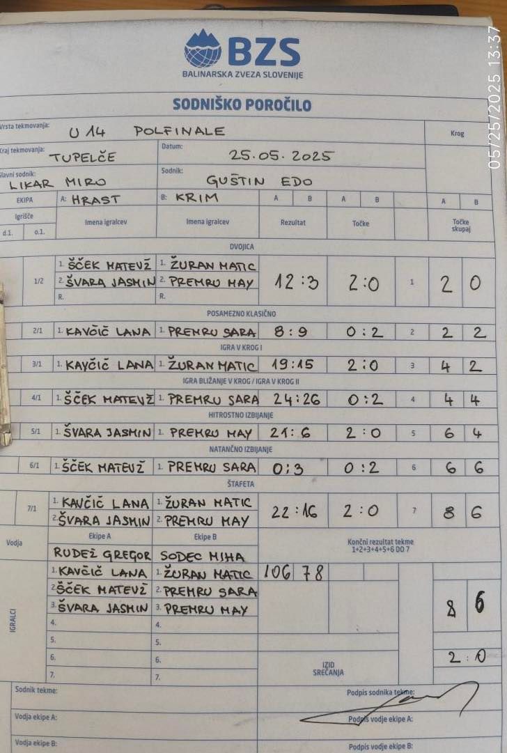Na današnjem zaključnem turnirju lige U-14 v Kobjeglavi je naslov državnega prvaka osvojil domači Hrast, ki je v velikem finalu ugnal Kozlek Kuteževo, medtem ko je v tekmi za tretje mesto Pivka Oro Met premagala ljubljanski GDP Krim. Priznanja najboljšim sta podelila član izvršnega odbora Balinarske zveze Slovenije in predsednik Območne balinarske zveze Sežana Tomaž Mahnič ter član Komisije za delo z mladimi in strokovnega štaba reprezentanc Dejan Korošec.