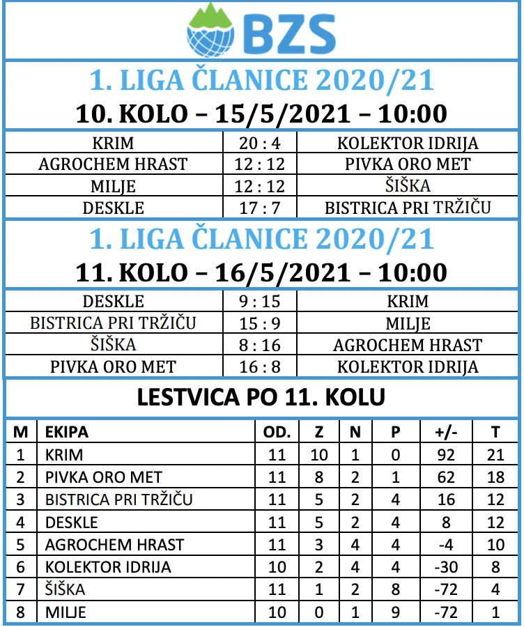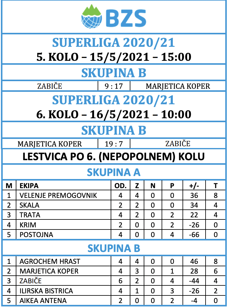 Konec tedna je prinesel nove dvoboje v Super lig ter 9. in 10. krog krog Lige U-18. V Super ligi vodilni položaj še naprej zaseda QAP Postojna, mesto v polfinalu pa si zagotovili tudi še Trata, Skala in Termoplasti Plama Ilirska Bistrica, medtem ko v mladinski ligi trenutno najbolje kaže ekipi Skala Hrast. Razpored tekem in rezultate lahko najdete na spletni strani BZS pod zavihkom Tekmovanja/Državne lige 2025/26 in preko aplikacije Challanger ter teletekstu RTV Slovenija.