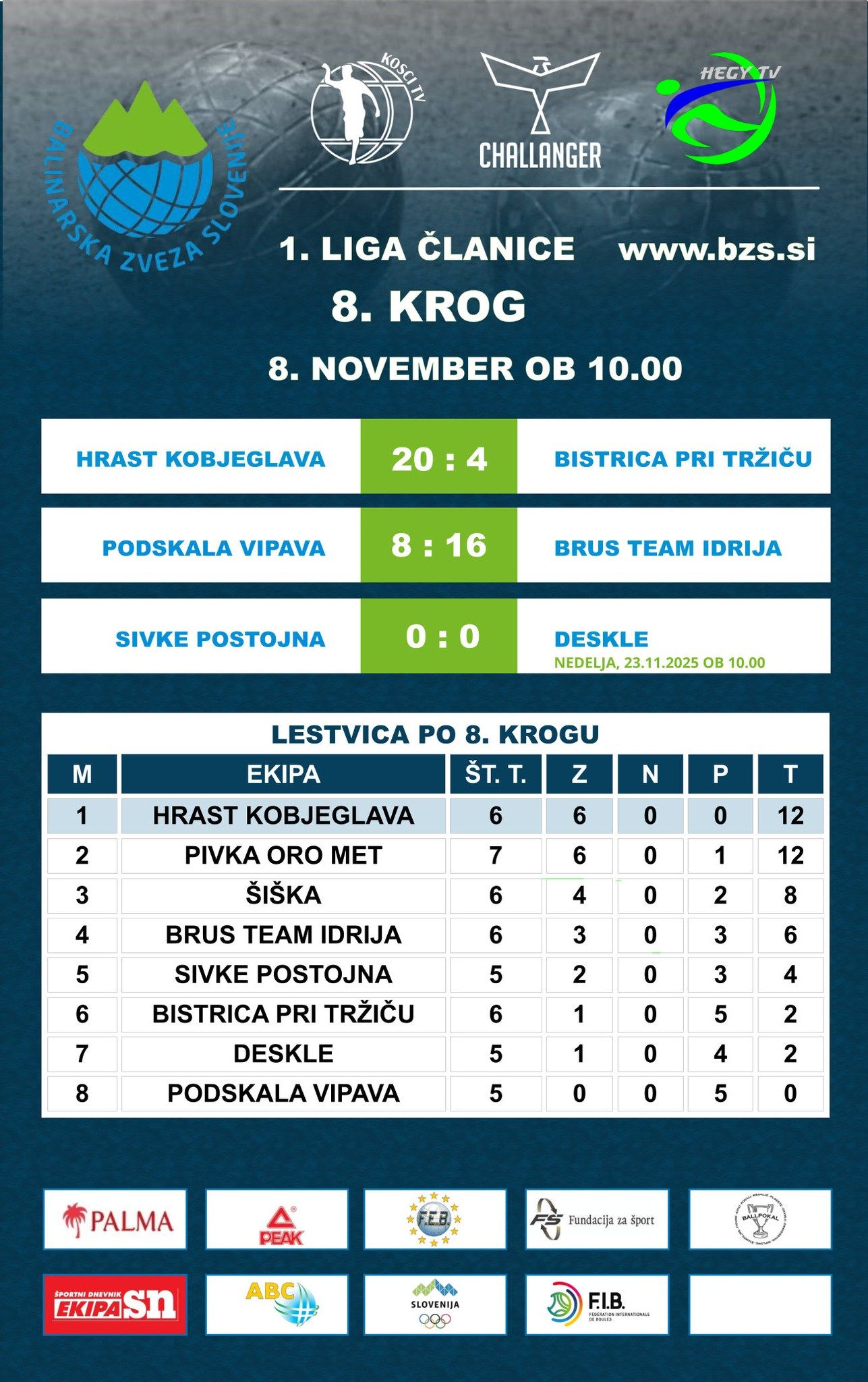 V soboto je bila odigranih večina tekem 8. kroga 1. lige - članice, v katerih sta slavili zasedbi kobjeglavskega Hrasta ter BrusTeam Idrije, in 3. kroga Super lige, na katerih so slavili balinarji škofjeloške Trate, Hrasta ter Termplasti Plame Ilirske Bistrice. Razpored tekem in rezultate lahko najdete na spletni strani BZS pod zavihkom Tekmovanja/Državne lige 2025/26 in preko aplikacije Challanger ter teletekstu RTV Slovenija.
