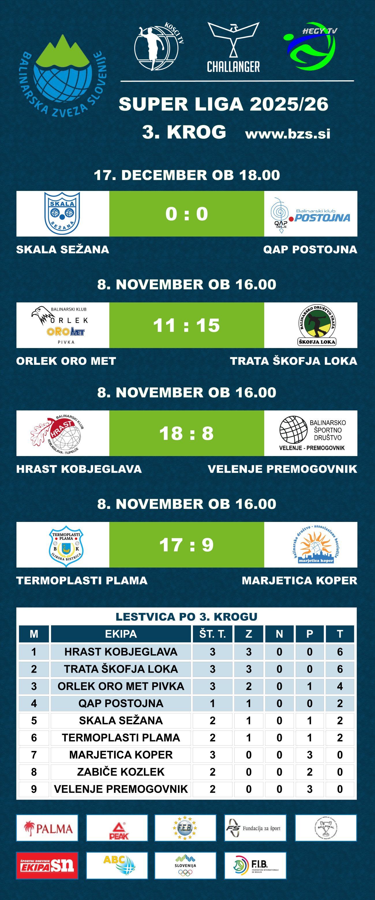 Sobotni 11. krog Super lige je prinesel štiri pomembne obračune, ki so vplivali na stanje na vrhu in v drugi polovici prvenstvene lestvice. Škofjeloška Trata je na gostovanju pred kamerami morala priznati premoč sežanski Skali, QAP Postojna je slavila na zahtevnem gostovanju v Zabičah, kobjeglavski Hrast je premagal Marjetico Koper, zadnjeuvrščeni Velenjčani pa so se z gostovanja v Pivki vrnili s prvo točko. Posnetek derbija iz Sežane si lahko ogledate na spodnji povezavi, razpored tekem in rezultate pa lahko najdete na spletni strani BZS pod zavihkom Tekmovanja/Državne lige 2025/26 in preko aplikacije Challanger ter teletekstu RTV Slovenija.