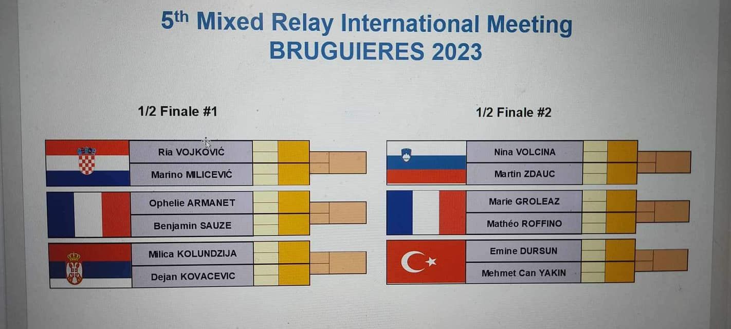 Na 5. Mednarodnem turnirju mešanih štafet v francoskem Bruguieresu je slovenska štafeta Nina Volčina - Martin Zdauc v dramatičnem finalu po razigravanju izgubila proti hrvaški navezi Ria Vojković - Marino Miličević 47:47 (24:25).
