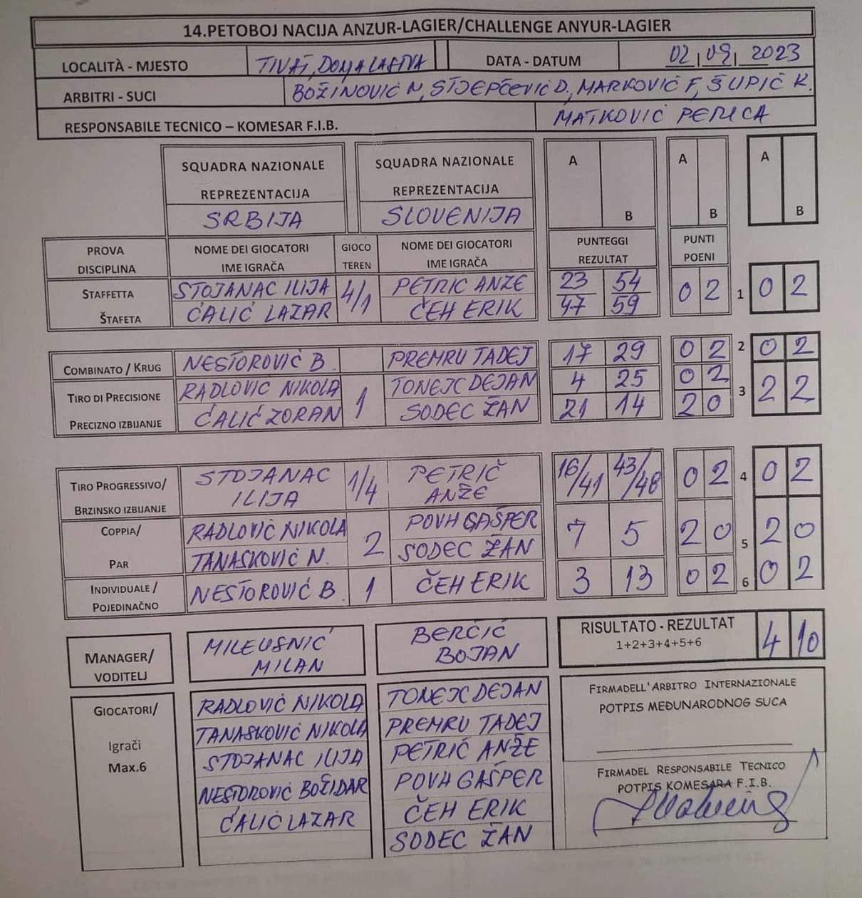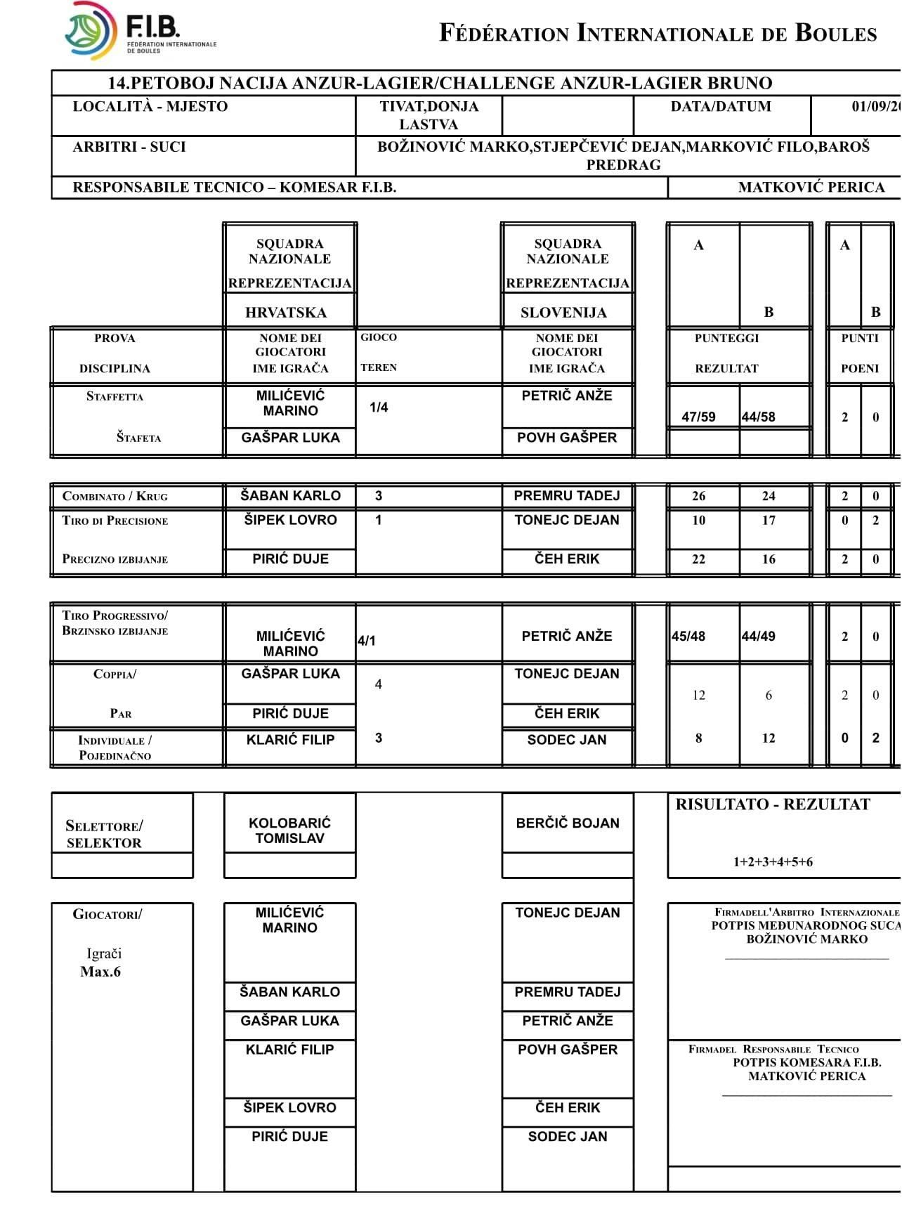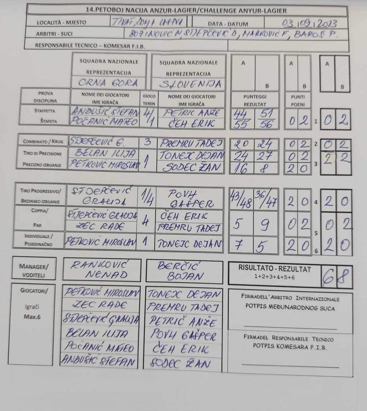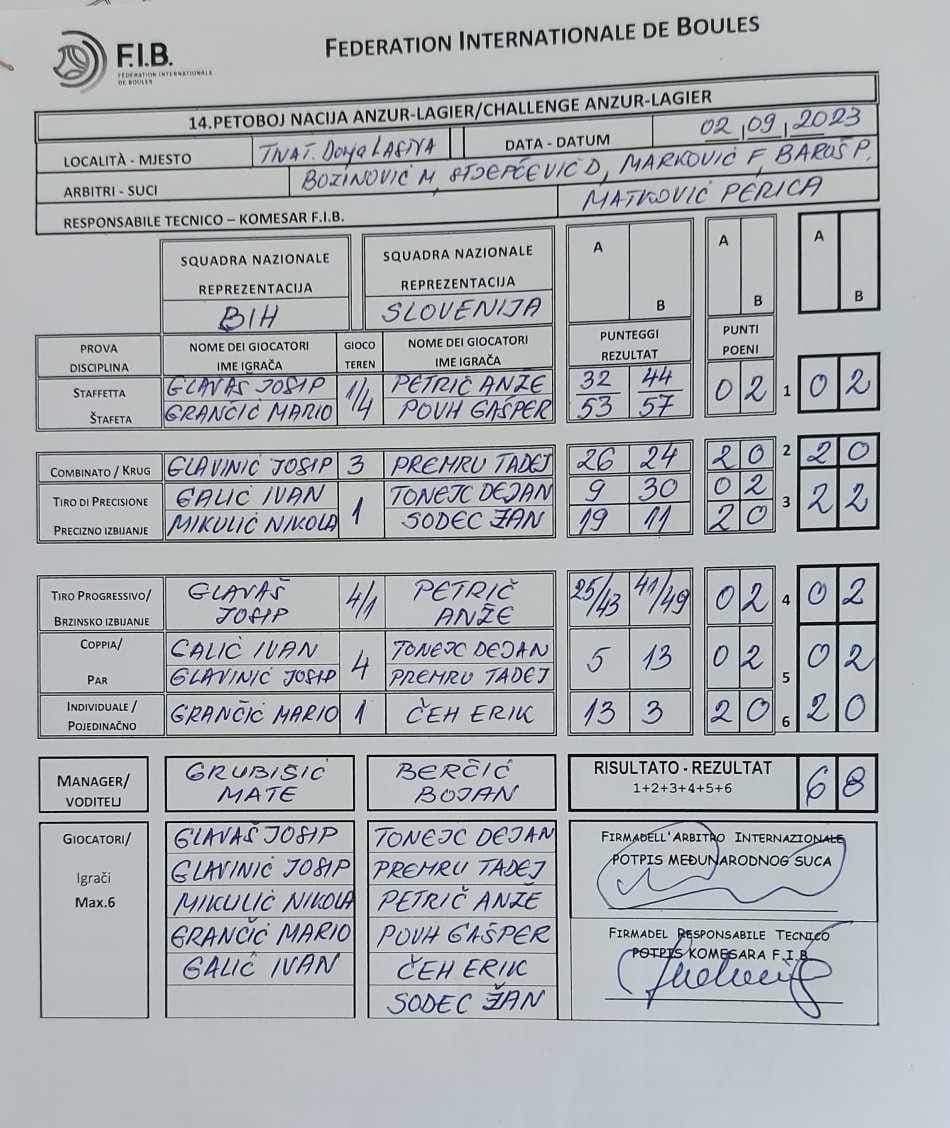 Slovenska moška članska reprezentanca je v zadnjem krogu Adriatic Bocce Confederation peteroboja v Črni Gori z zmago proti domačinom z 8:6 osvojila končno drugo mesto, zmagovalni pokal je ob istem številu osvojenih točk dvignila Hrvaška, tretje mesto je osvojila BIH, četro Črna Gora, peto pa Srbija.