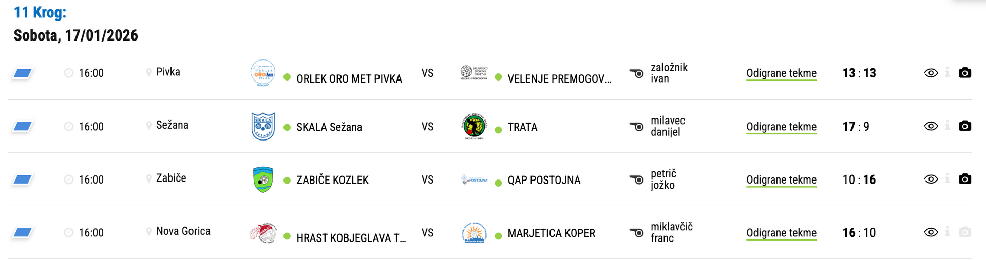 Sobotni 11. krog Super lige je prinesel štiri pomembne obračune, ki so vplivali na stanje na vrhu in v drugi polovici prvenstvene lestvice. Škofjeloška Trata je na gostovanju pred kamerami morala priznati premoč sežanski Skali, QAP Postojna je slavila na zahtevnem gostovanju v Zabičah, kobjeglavski Hrast je premagal Marjetico Koper, zadnjeuvrščeni Velenjčani pa so se z gostovanja v Pivki vrnili s prvo točko. Posnetek derbija iz Sežane si lahko ogledate na spodnji povezavi, razpored tekem in rezultate pa lahko najdete na spletni strani BZS pod zavihkom Tekmovanja/Državne lige 2025/26 in preko aplikacije Challanger ter teletekstu RTV Slovenija.