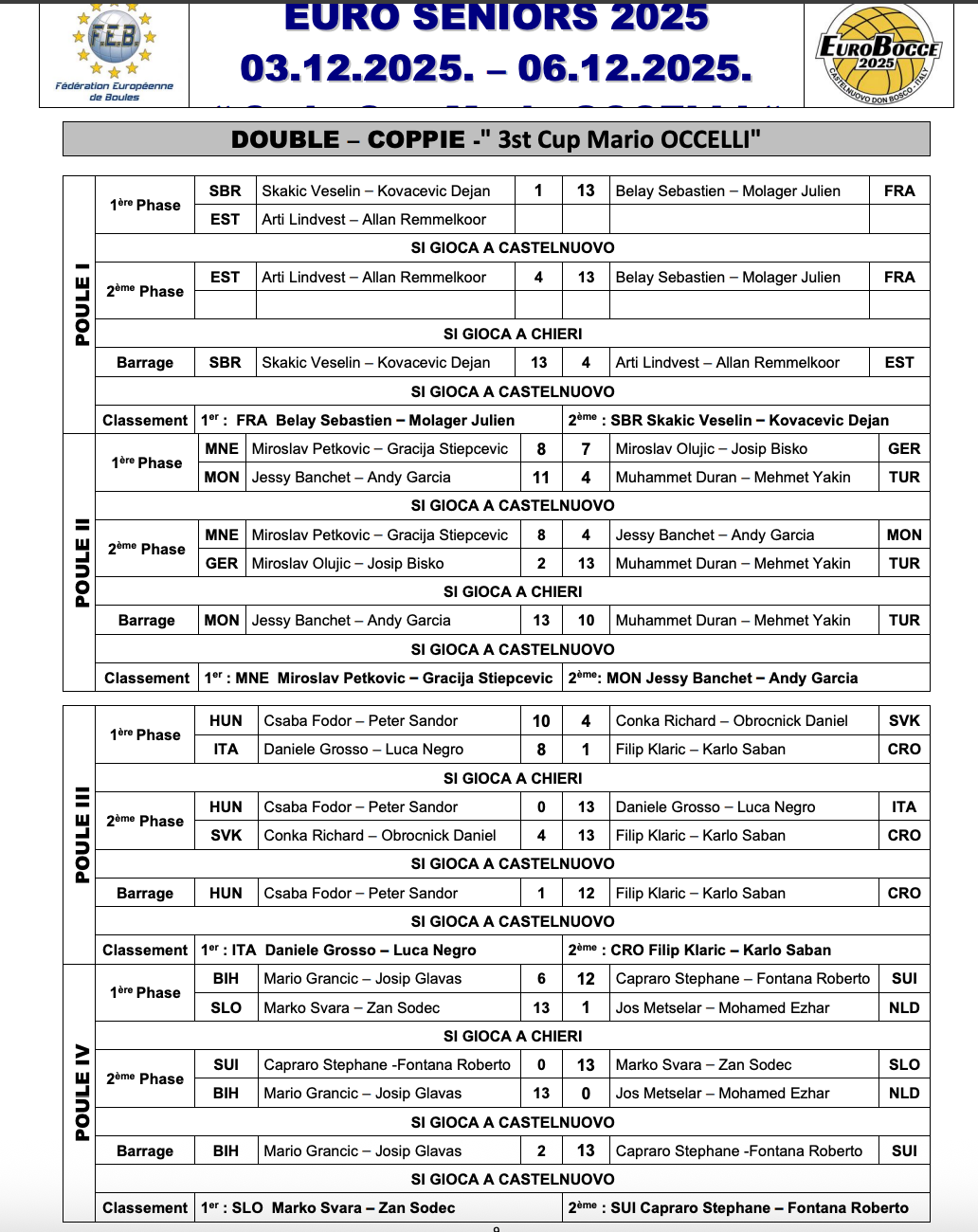 08.30 Dvojice, 1. krog: Švara, Sodec (Slovenija) - Metselar, Ezhar (Nizozemska) 13:1, Švara in Sodec zvečer ob 21.00 tekma za prvo mesto v skupini proti Capraro, Fontana (Švica)