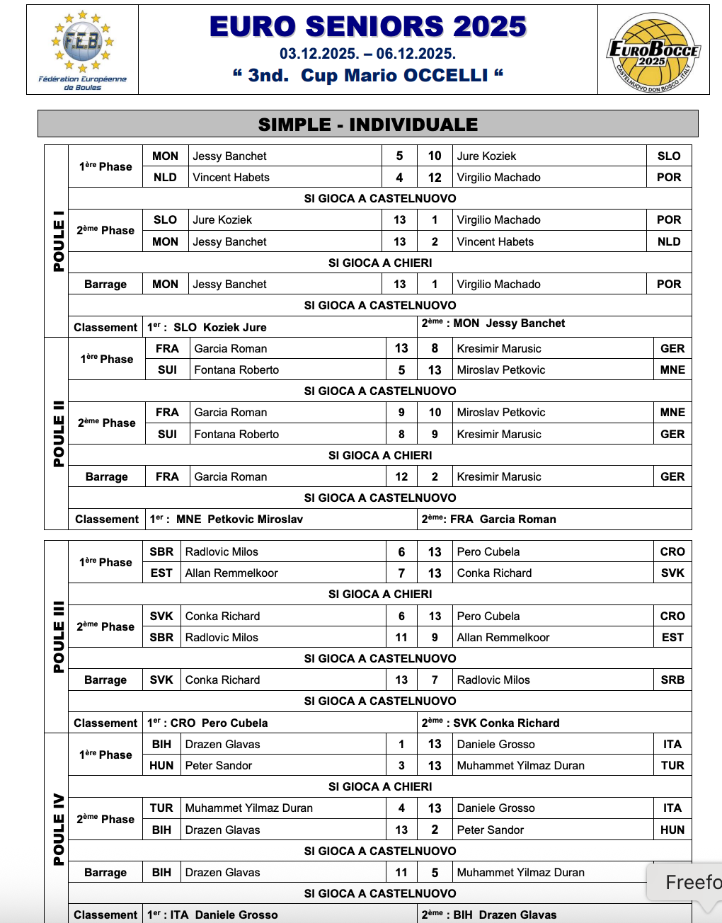 18.00 Posamezno, 1. krog: Kozjek (Slovenija) - Banchet (Monako) 10:5, Kozjek v četrtek ob 8.00 tekma za prvo mesto v skupini proti Machadu (Portugalska)