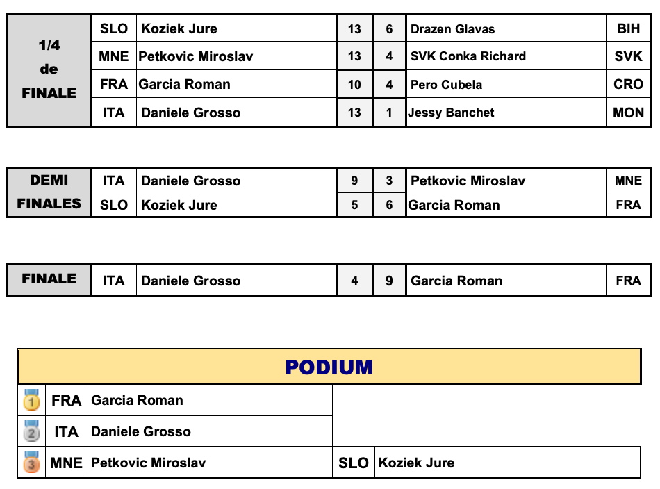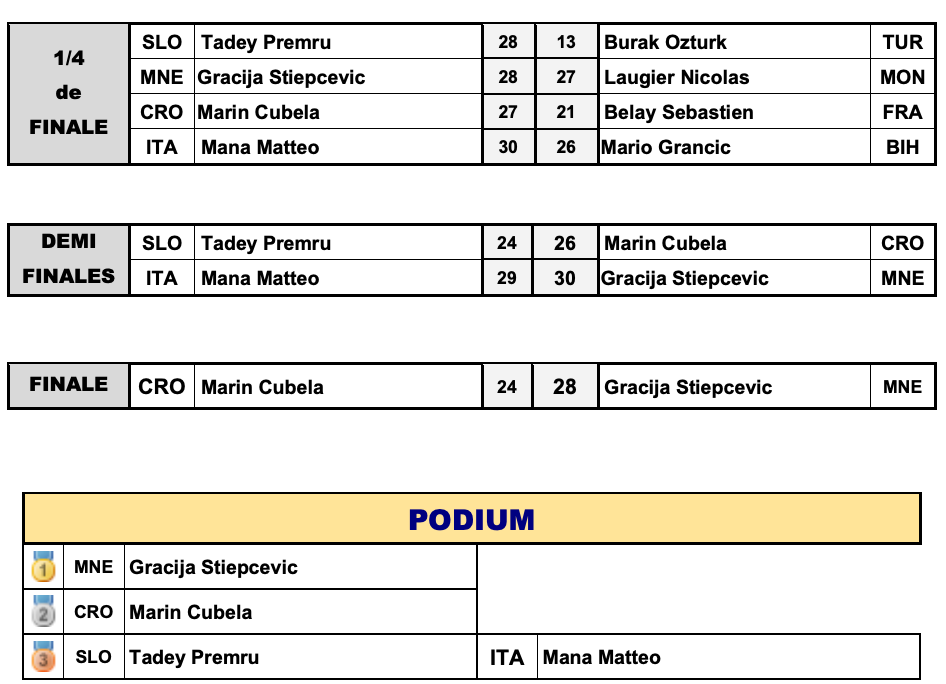 Zmagovitega niza je bilo konec v petkovih polfinalih, ko je naprej Martin Zdauc šele po podaljšku in porazu s 47:47 (10:8) moral stisniti roko Francozu Fredericu Marsensu, nato sta brez velikega finala ostala še Tadej Premru po porazu v igri v krog z 28:24 proti Hrvatu Marinu Ćubeli ter Jure Kozjek, ki je bil v trilerju poražen proti Francozu Romainu Garciji s 6:5.