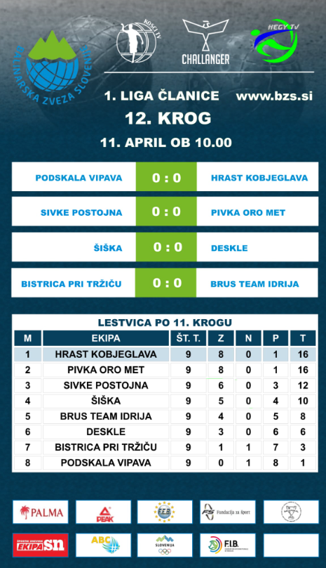 Po krajšem velikonočnem premoru bodo v soboto odigrane tekme 12. kroga 1. lige - članice. Kobjeglavski Hrast bo gostoval pri Podskali, v Postojni bo na sporedu sosedski derbi med Sivkami in Pivko Oro Met, Desklanke čaka gostovanje v Šiški, Bistrica pri Tržiču pa bo gostila idrijski Brus Team. Razpored tekem in rezultate lahko najdete na spletni strani BZS pod zavihkom Tekmovanja/Državne lige 2025/26 in preko aplikacije Challanger ter teletekstu RTV Slovenija.