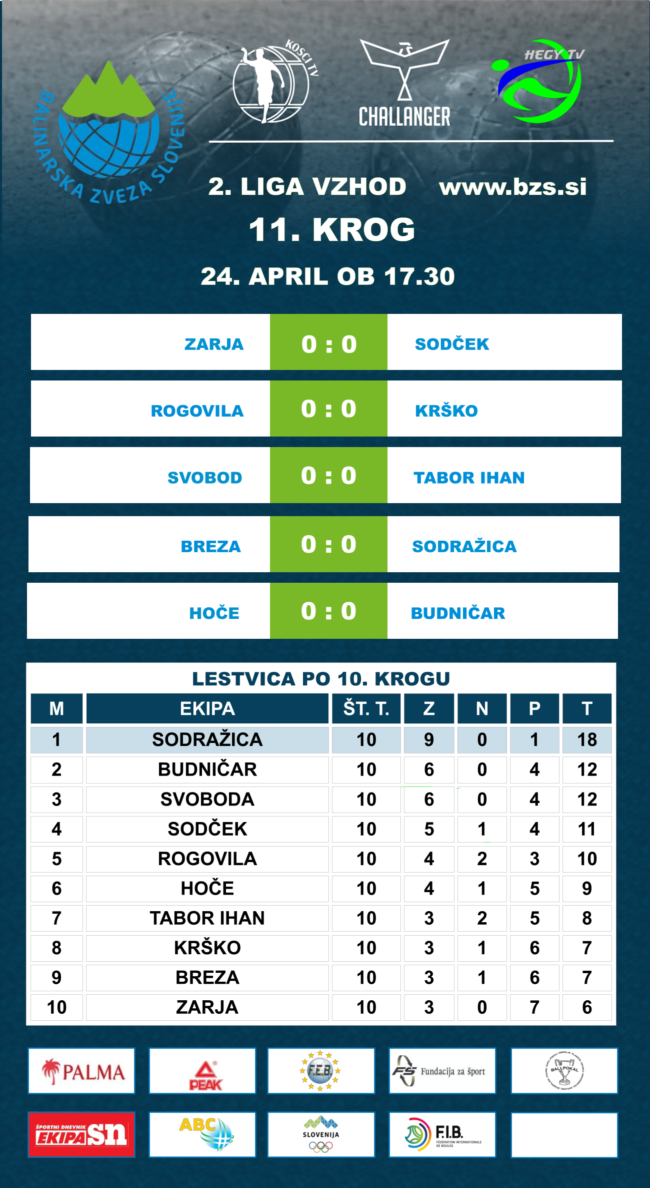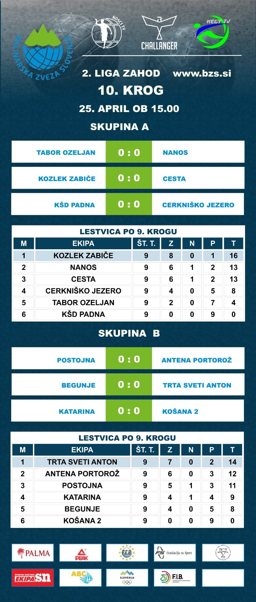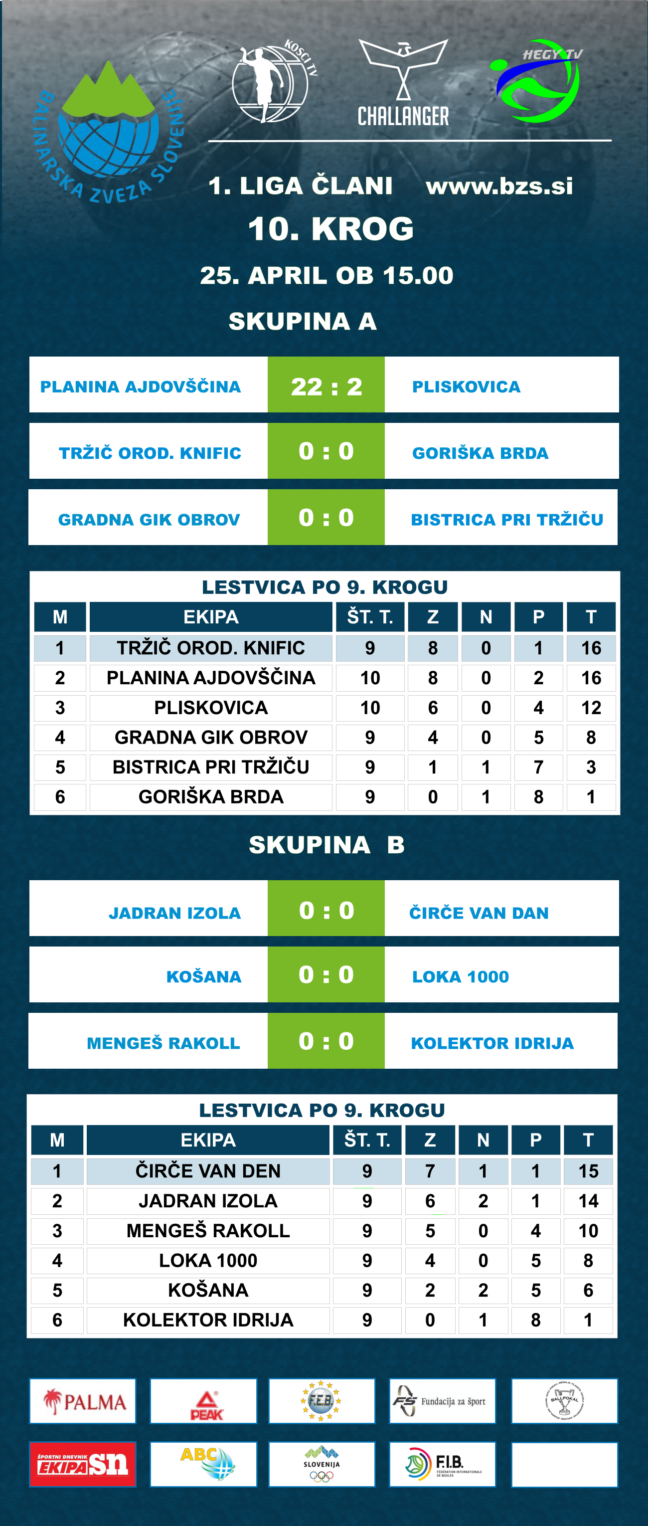 Konec tedna je ponudil pestro balinarsko dogajanje, saj so bili ob dvobojih 13. kroga 1. lige - članice na sporedu tudi prvi spomladanski dvoboji v moški 1. in 2. ligi ter turnirja lige U-18 v Straži pri Novem mestu in Pivki. Razpored tekem in rezultate lahko najdete na spletni strani BZS pod zavihkom Tekmovanja/Državne lige 2025/26 in preko aplikacije Challanger ter teletekstu RTV Slovenija.