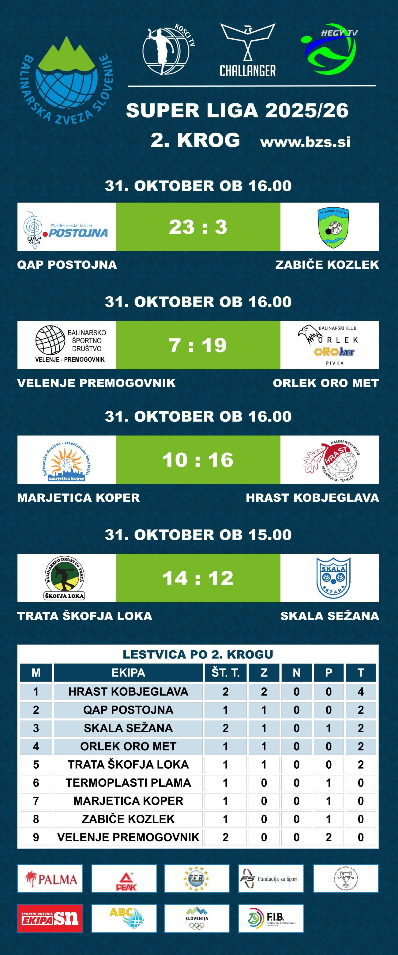 V balinarski Super ligi je v četrtkovem vnaprej odigranem dvoboju 7. kroga Marjetica Koper morala na domačem igrišču priznati premoč QAP Postojni s 4:22, v soboto pa bodo odigrane vse štiri tekme 6. kroga, v katerih so slavili Trata, Termoplasti Plama Ilirska Bistrica, Zabiče Kozlek in Skala. Razpored tekem in rezultate lahko najdete na spletni strani BZS pod zavihkom Tekmovanja/Državne lige 2025/26 in preko aplikacije Challanger ter teletekstu RTV Slovenija, obračun iz Sežane pa si lahko v posnetku ogledate preko Youtube kanala Kosci TV in spletne strani BZS.