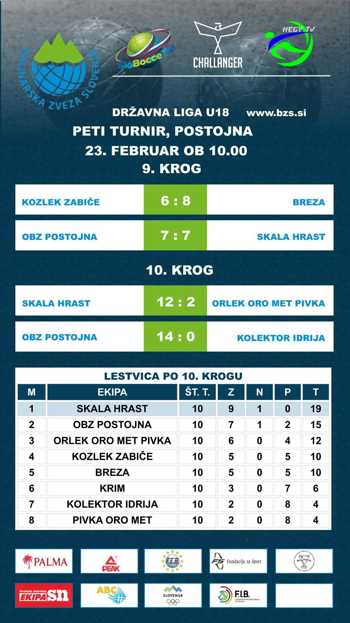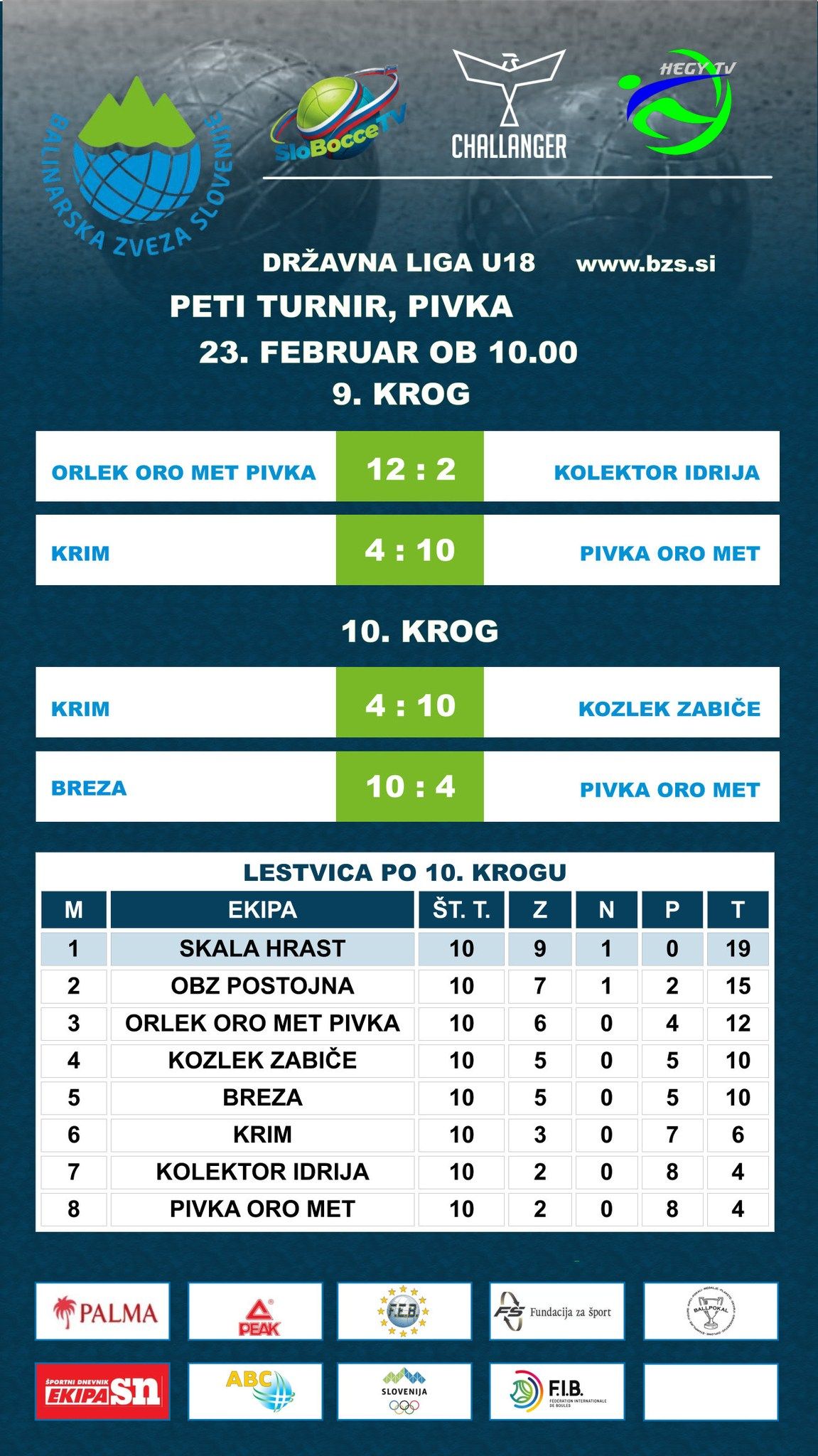 Konec tedna je prinesel nove dvoboje v Super lig ter 9. in 10. krog krog Lige U-18. V Super ligi vodilni položaj še naprej zaseda QAP Postojna, mesto v polfinalu pa si zagotovili tudi še Trata, Skala in Termoplasti Plama Ilirska Bistrica, medtem ko v mladinski ligi trenutno najbolje kaže ekipi Skala Hrast. Razpored tekem in rezultate lahko najdete na spletni strani BZS pod zavihkom Tekmovanja/Državne lige 2025/26 in preko aplikacije Challanger ter teletekstu RTV Slovenija.
