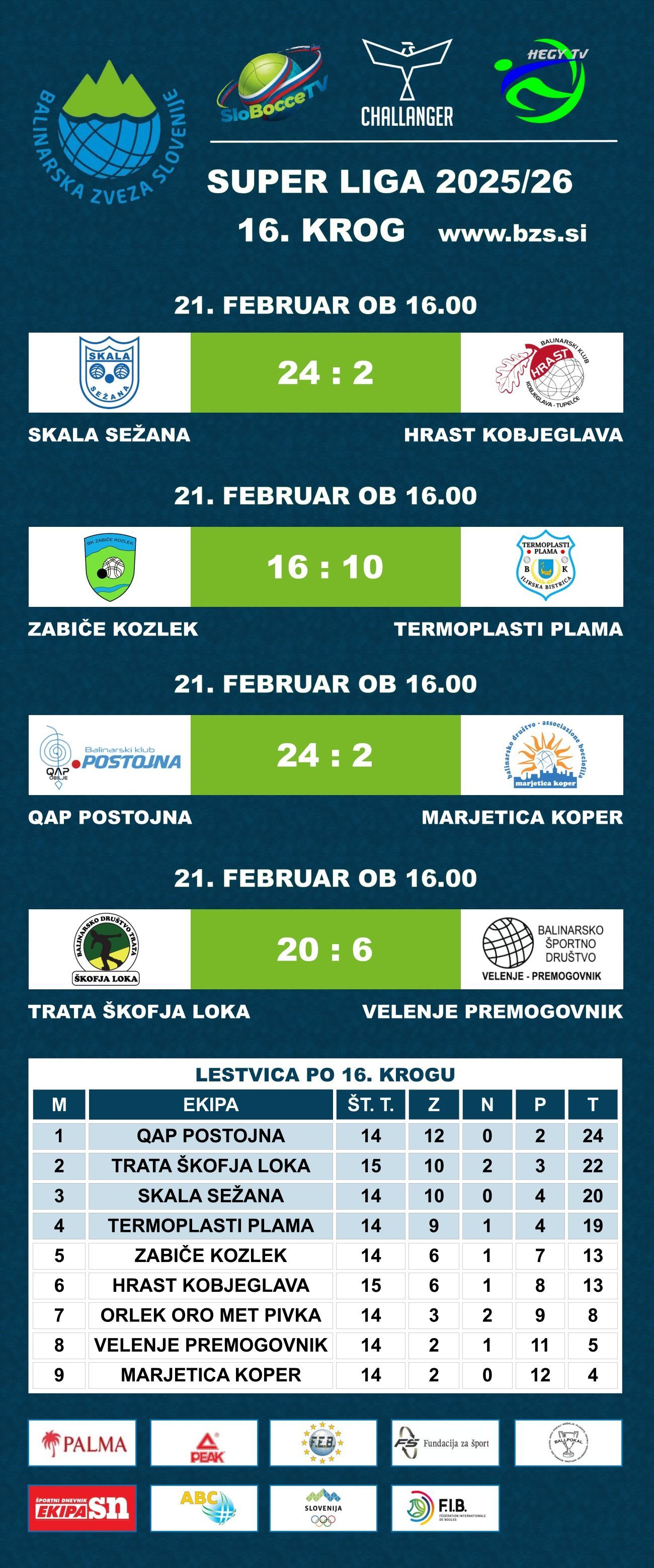 V nedeljo popoldne se je zaključila polfinalna serija Super lige, v kateri sta si mesto v finalu priigrala QAP Postojna in Skala Sežana, medtem ko so si bronaste medalje okoli vratu nadeli balinarji Termoplasti Plame Ilirske Bistrice in škofjeloške Trate. Razpored tekem in rezultate lahko najdete na spletni strani BZS pod zavihkom Tekmovanja/Državne lige 2025/26 in preko aplikacije Challanger ter teletekstu RTV Slovenija. Vse tekme končnice si boste lahko ogledali V ŽIVO v neposrednih prenosih preko spletne strani BZS v sodelovanju s Slo Bocce TV & HEGY TV.