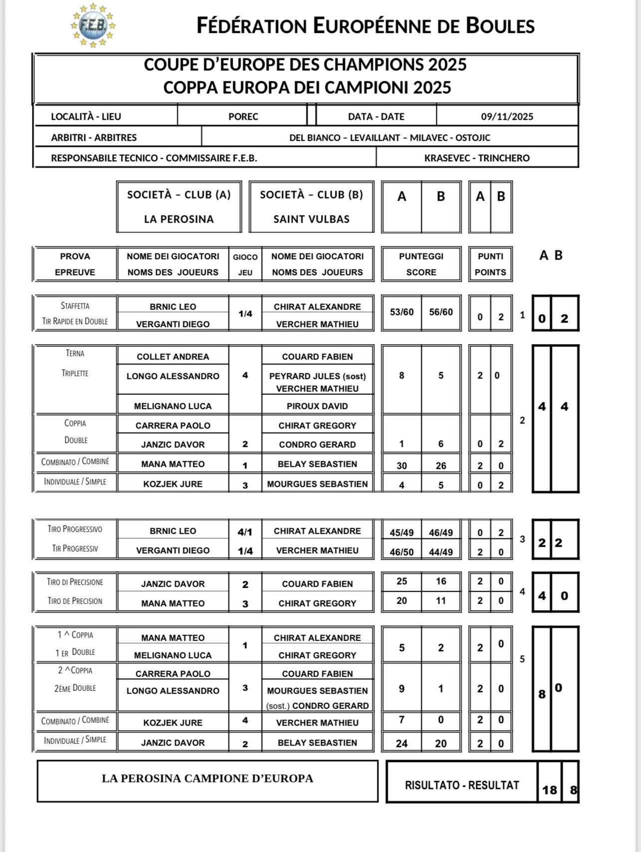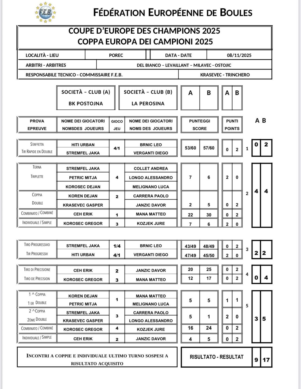 Hrvaški Poreč je konec tedna gostil Zaključni turnir moškega evropskega klubskega pokala. Slovenski podprvak QAP Postojna se je v sobotnem dopoldanskem polfinalu pomeril proti branilki naslova italijanski La Perosini, za katero nastopata tudi Slovenca Davor Janžič in Jure Kozjek, in po porazu s 6:14 tekmovanje zaključil na tretjem mestu. V sobotnem popoldanskem polfinalu pomerila italijanska BRB Ivrea in francoski Saint Vulbas, ki je bil boljši po podaljšku s 13:13 (2:1), v nedeljski finalni tekmi pa je La Perosina slavila z 18:8. Posnetke vseh tekem si lahko ogledate preko Youtube kanala Kosci TV ter preko povezav na Facebook strani in spletni strani Balinarske zveze Slovenije ter Facebook strani Evropske balinarske zveze.