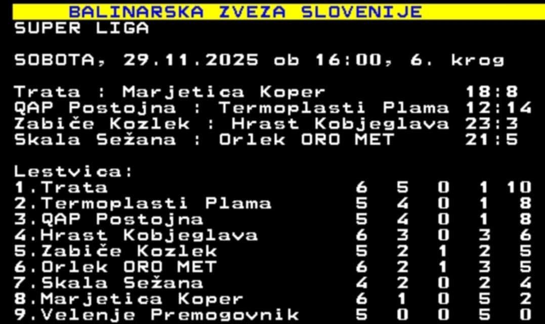 V balinarski Super ligi je v četrtkovem vnaprej odigranem dvoboju 7. kroga Marjetica Koper morala na domačem igrišču priznati premoč QAP Postojni s 4:22, v soboto pa bodo odigrane vse štiri tekme 6. kroga, v katerih so slavili Trata, Termoplasti Plama Ilirska Bistrica, Zabiče Kozlek in Skala. Razpored tekem in rezultate lahko najdete na spletni strani BZS pod zavihkom Tekmovanja/Državne lige 2025/26 in preko aplikacije Challanger ter teletekstu RTV Slovenija, obračun iz Sežane pa si lahko v posnetku ogledate preko Youtube kanala Kosci TV in spletne strani BZS.
