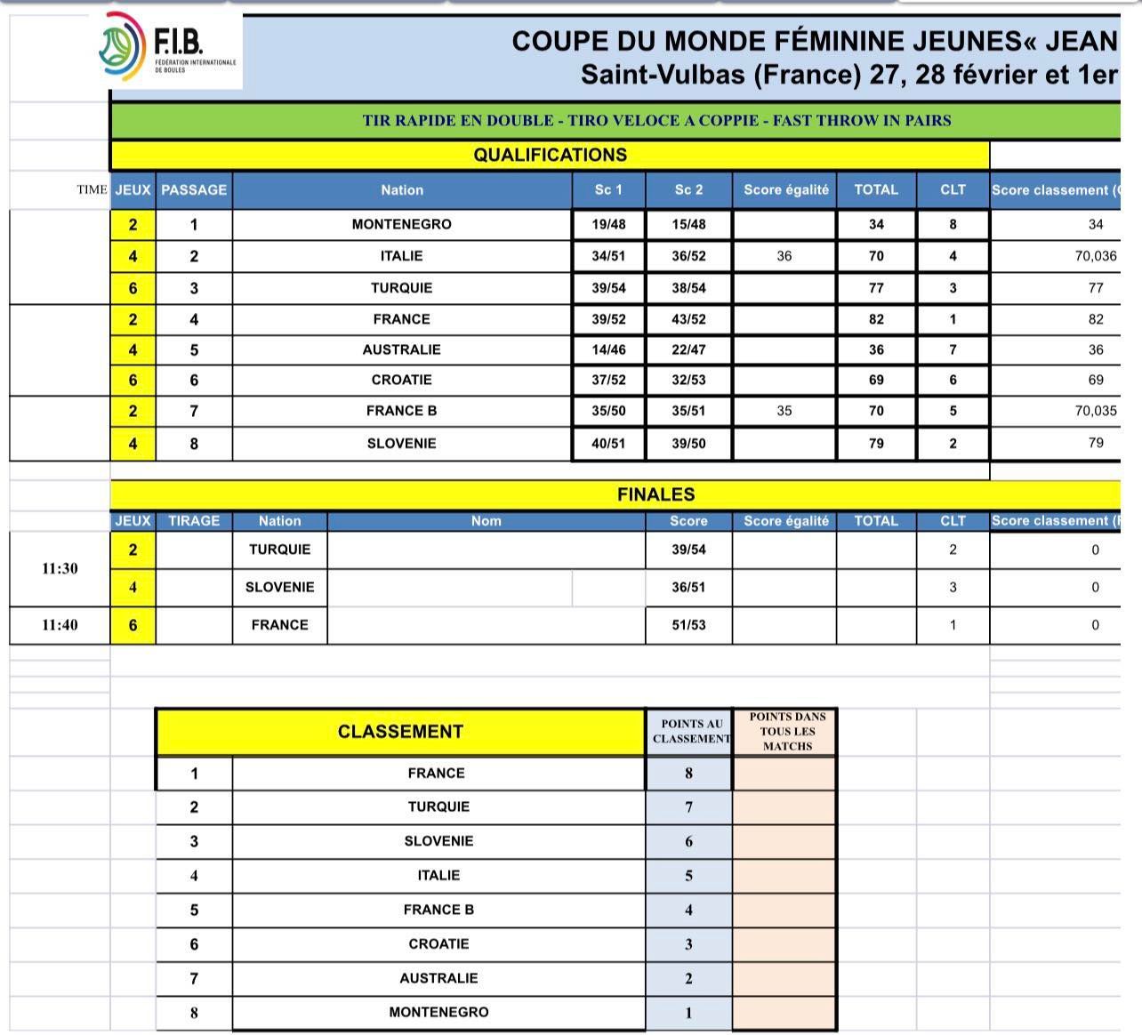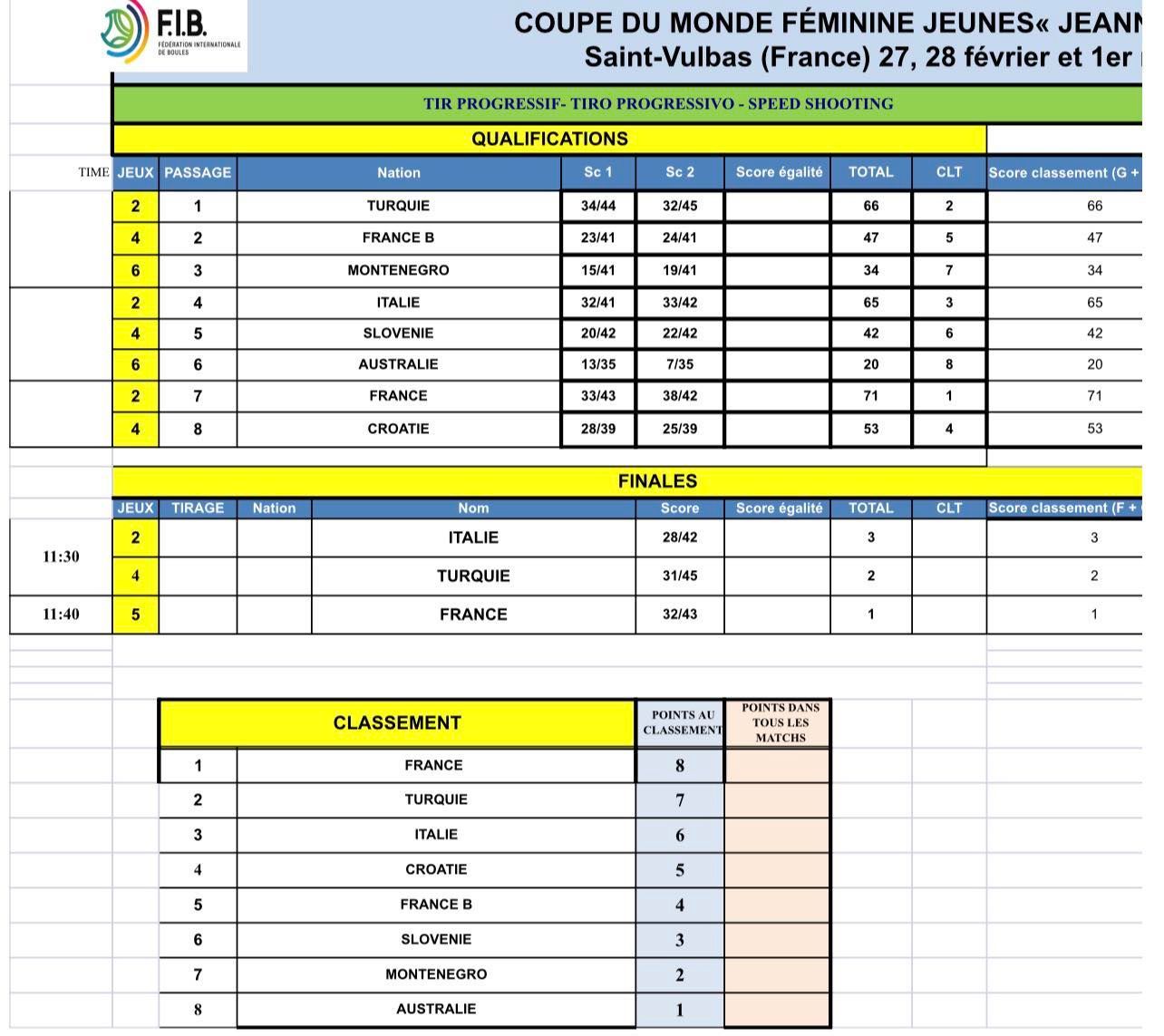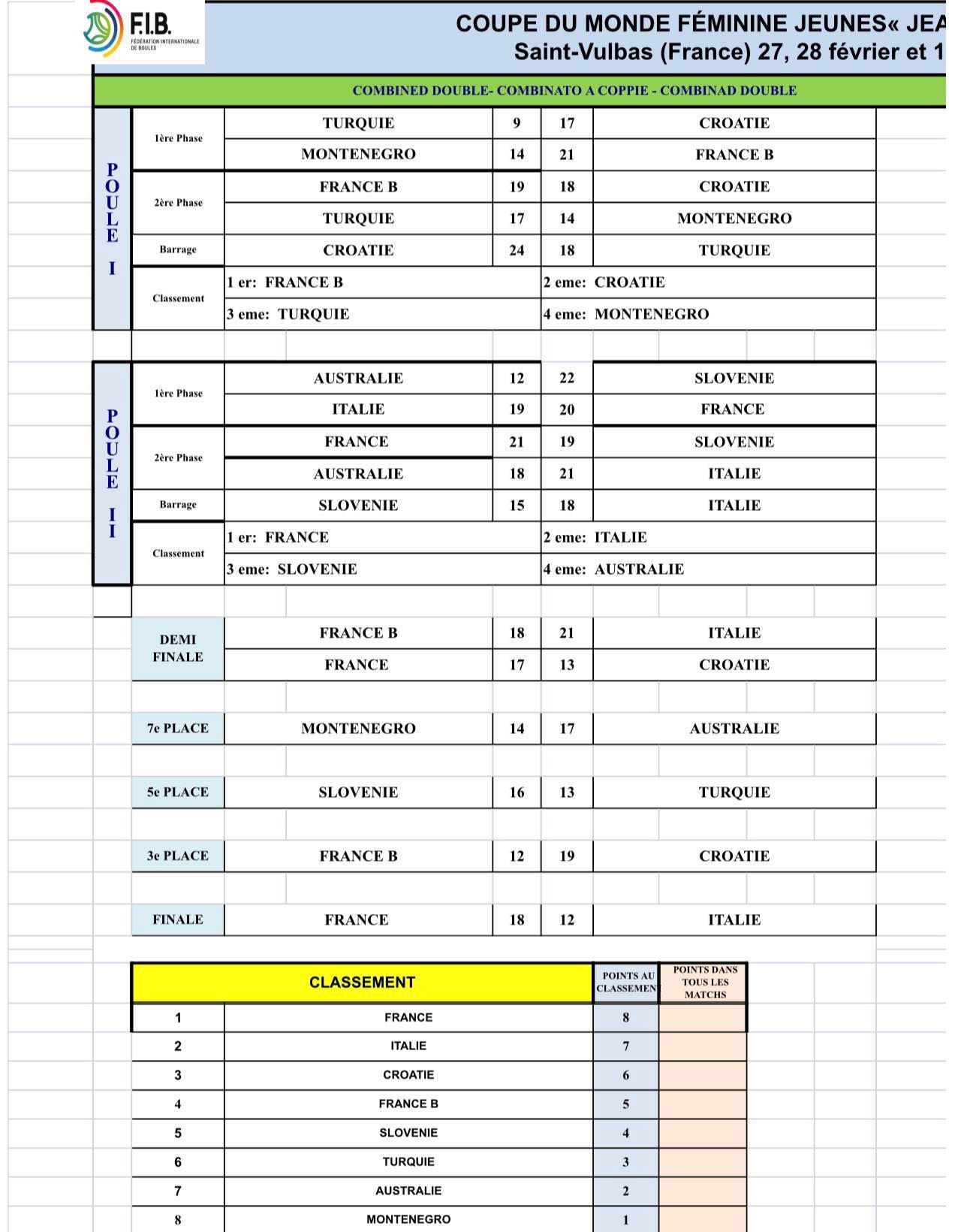 V francoskem Saint Vulbasu se je v nedeljo zaključil Svetovni pokal za ženske do 23 let. Pod vodstvom Damjana Sofronievskega in Dejana Korošca so v šestih disciplinah, ki se točkujejo za skupni seštevek, v konkurenci osmih držav Slovenijo zastopale Rebecca Martulaš, Eneja Ozbič Primc, Lana Simonič Starič in Karin Šmit. Slovenke so nastopile v treh finalih in si v skupnem seštevku zagotovile končno tretje mesto za zmagovalko Francijo in drugouvrščeno Italijo. Naveza Ozbič Primc - Martulaš se lahko pohvali z rekordnimi 49 točkami v drugem kvalifikacijskem krogu natančnega zbijanja dvojic. Posnetke si lahko ogledate preko povezav na spletni in Facebook strani BZS ter Facebook strani Youtube kanalu Fibtv Sportboules.
