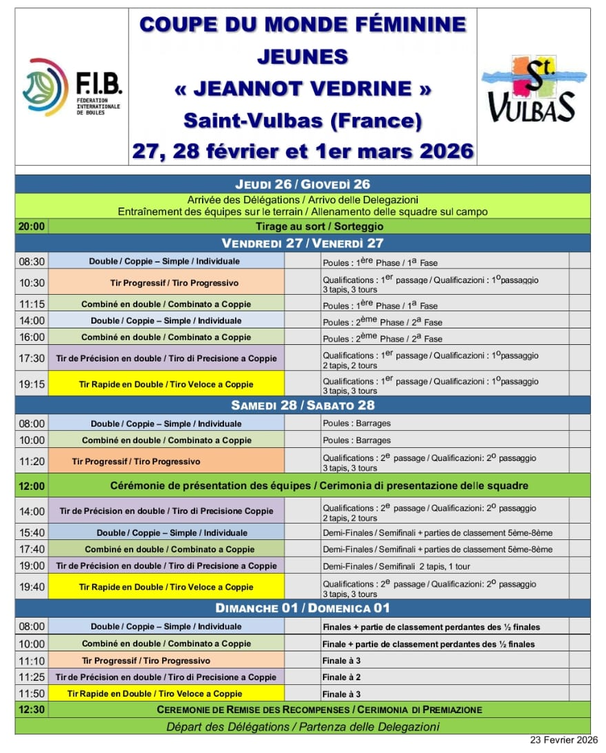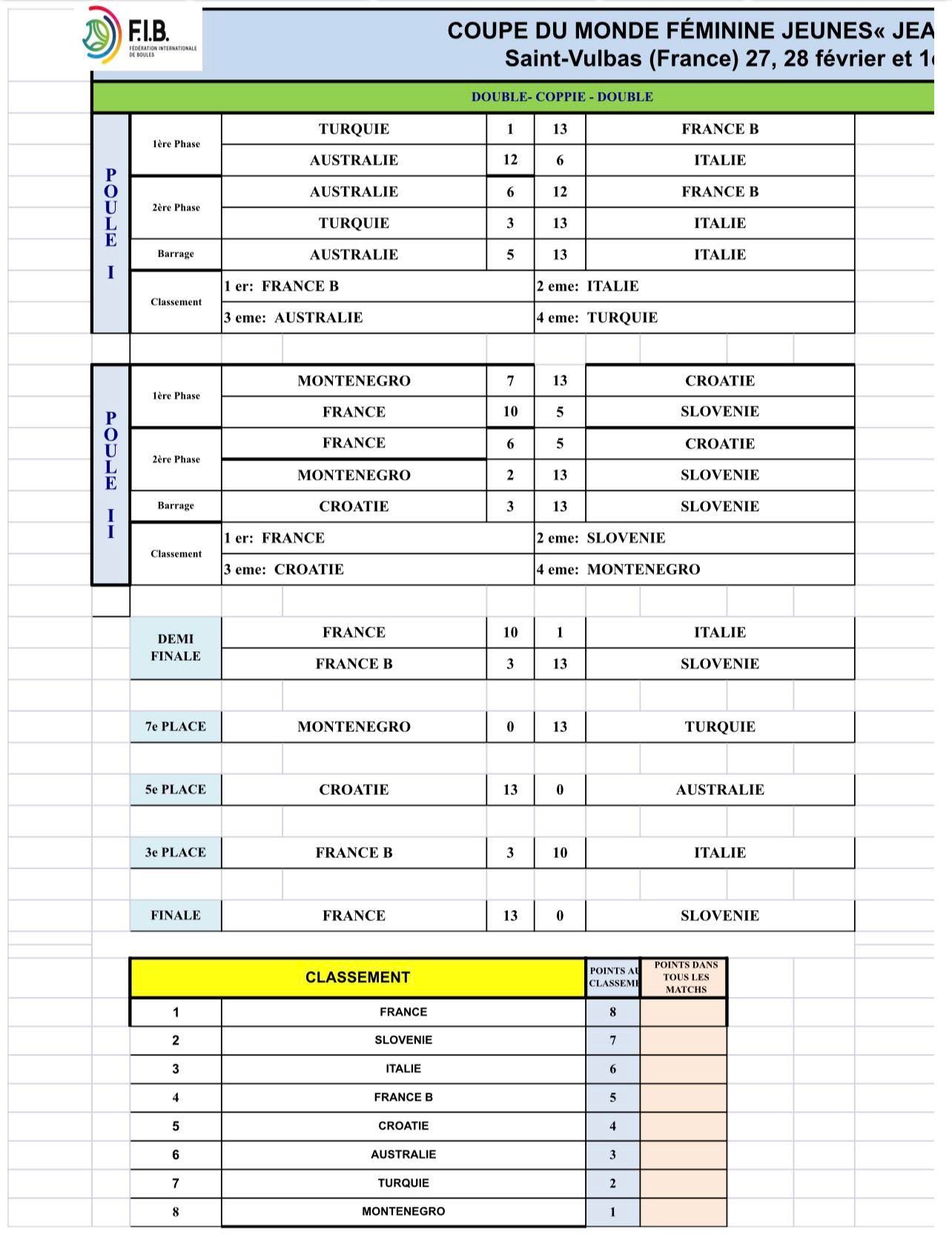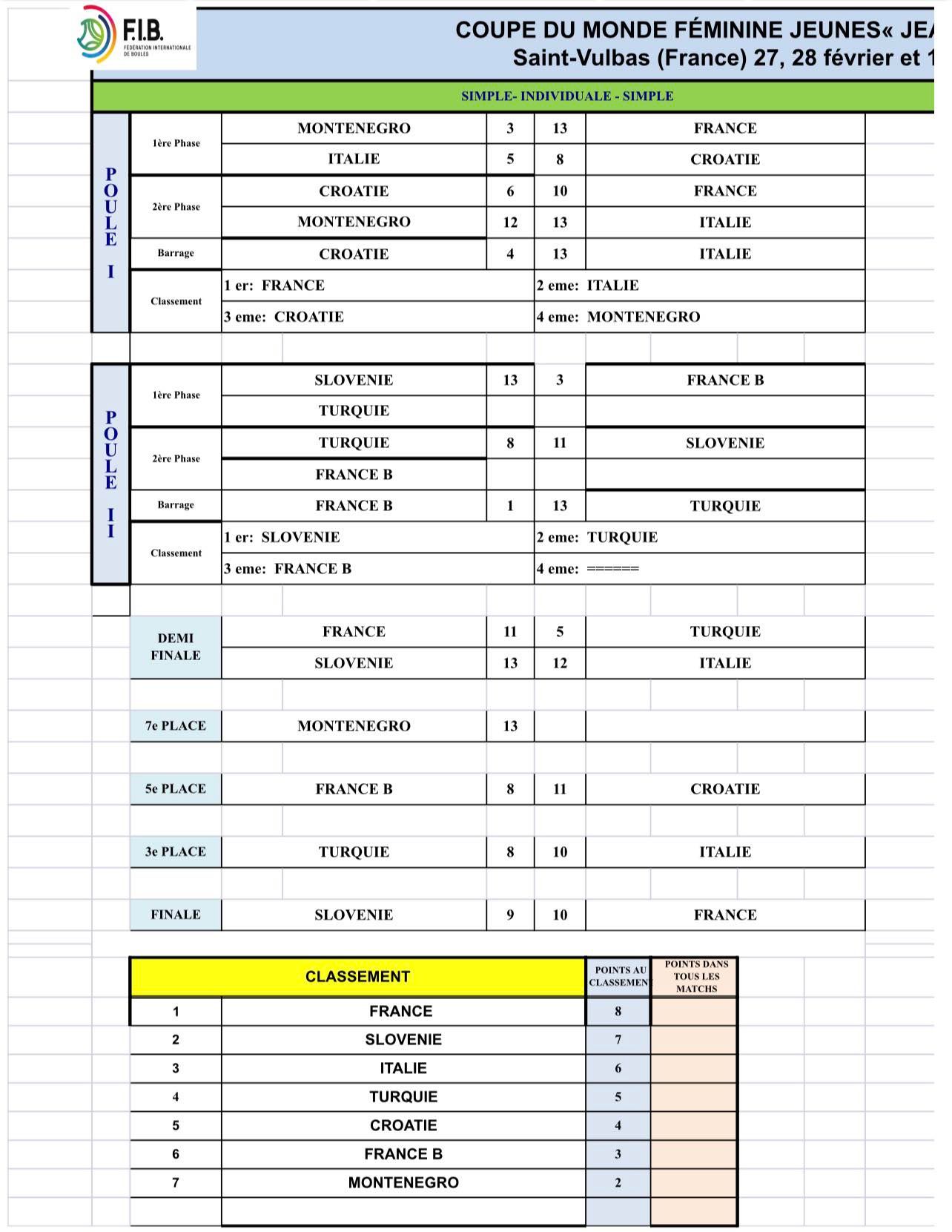 V francoskem Saint Vulbasu se je v nedeljo zaključil Svetovni pokal za ženske do 23 let. Pod vodstvom Damjana Sofronievskega in Dejana Korošca so v šestih disciplinah, ki se točkujejo za skupni seštevek, v konkurenci osmih držav Slovenijo zastopale Rebecca Martulaš, Eneja Ozbič Primc, Lana Simonič Starič in Karin Šmit. Slovenke so nastopile v treh finalih in si v skupnem seštevku zagotovile končno tretje mesto za zmagovalko Francijo in drugouvrščeno Italijo. Naveza Ozbič Primc - Martulaš se lahko pohvali z rekordnimi 49 točkami v drugem kvalifikacijskem krogu natančnega zbijanja dvojic. Posnetke si lahko ogledate preko povezav na spletni in Facebook strani BZS ter Facebook strani Youtube kanalu Fibtv Sportboules.