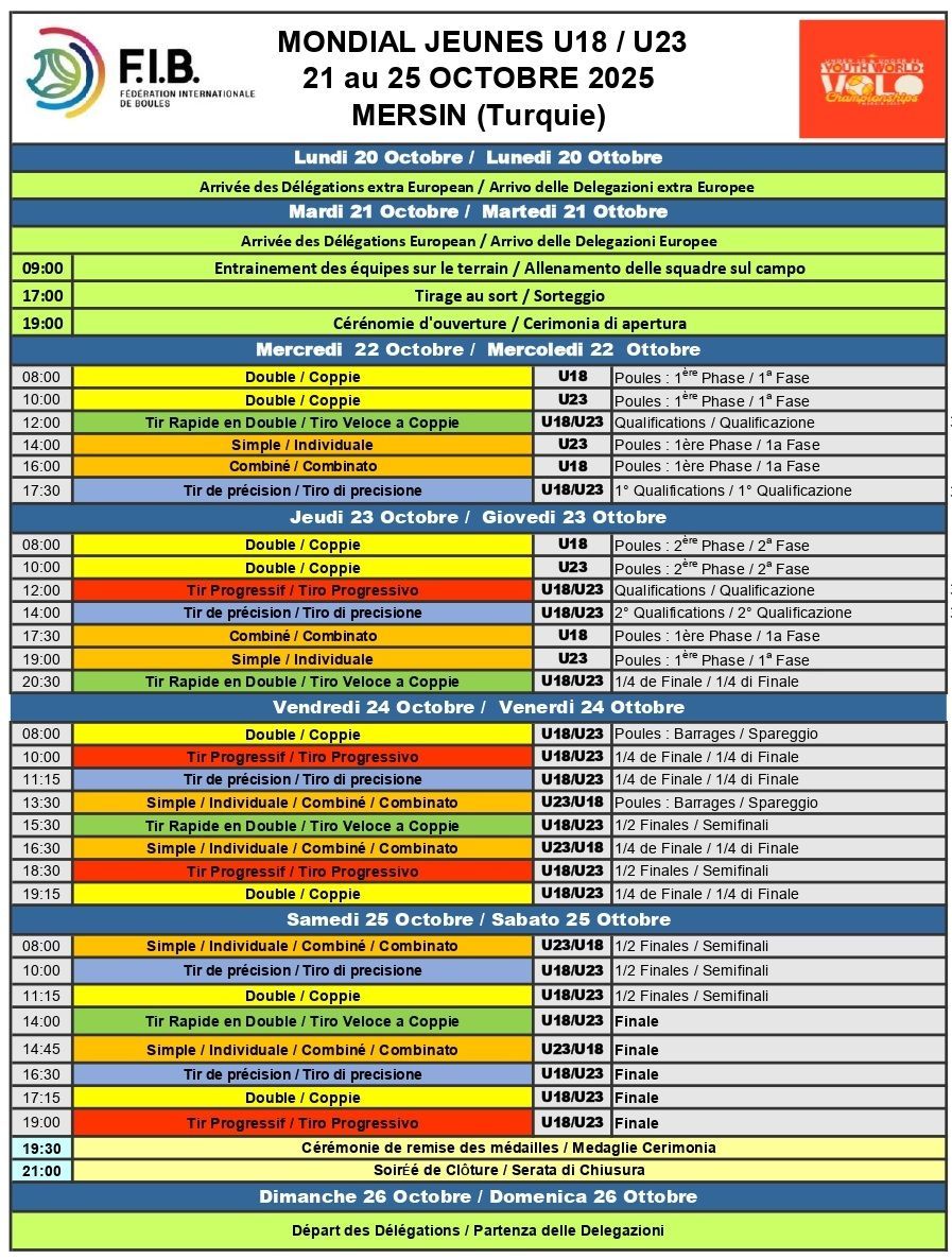 Turški Mersin gosti svetovno prvenstvo v balinanju za mladince in mlajše člane. V torek je na sporedu uradni trening, žreb in slavnostna otvoritev, sreda pa prinaša začetek tekmovalnega programa, ki bo trajal do sobotnega večera. Vse aktualne informacije in rezultate ter povezave do neposrednih prenosov lahko najdete na Facebook strani Balinarske zveze Slovenije.