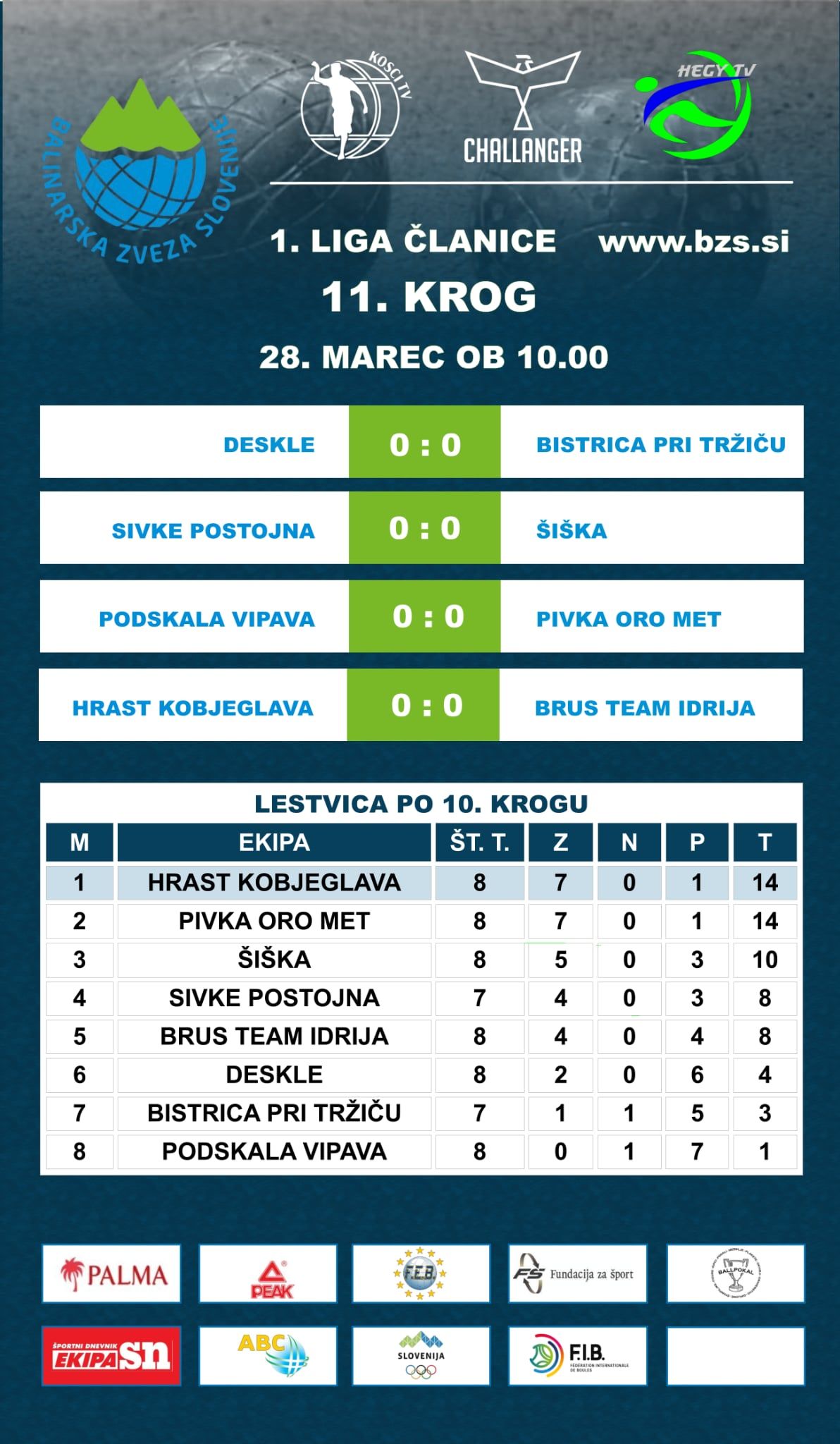 V petek popoldne ob 17.30 uri bo v Postojni odigrana zaostala tekma 10. kroga 1. lige - članice med Bistrico pri Tržiču in Sivkami, v soboto dopoldne pa bodo na sporedu tekme 11. kroga. Razpored tekem in rezultate lahko najdete na spletni strani BZS pod zavihkom Tekmovanja/Državne lige 2025/26 in preko aplikacije Challanger ter teletekstu RTV Slovenija.