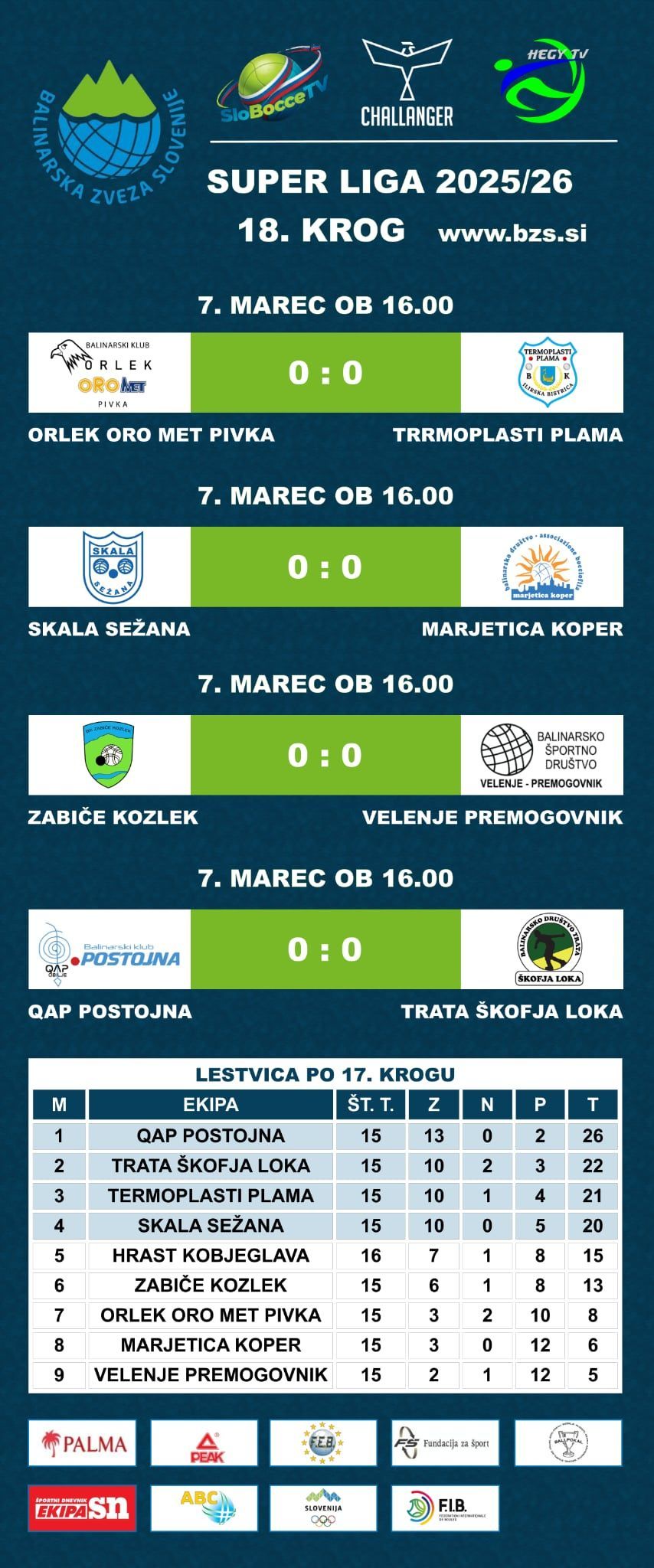V sobotnem zadnjem krogu rednega dela Super lige bo padla odločitev o parih polfinala, ki se bo pričelo 14. marca, ter obstanku v elitni moški balinarski druščini. Razpored tekem in rezultate lahko najdete na spletni strani BZS pod zavihkom Tekmovanja/Državne lige 2025/26 in preko aplikacije Challanger ter teletekstu RTV Slovenija.